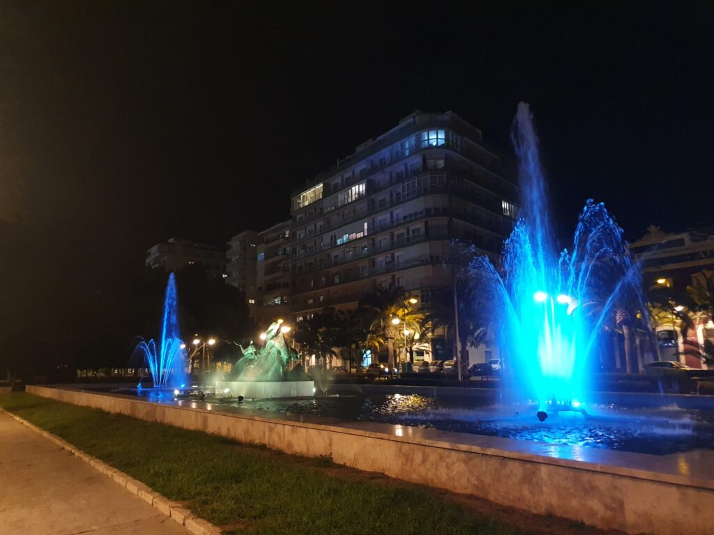Al caer la noche, las fuentes del Parque Nicolás Salmerón y de la rotonda de la Residencia Ballesol se tiñeron de los colores de la bandera del país, azul y amarillo, para visibilizar el apoyo de la ciudad de Almería, unida en bloque contra la invasión rusa.