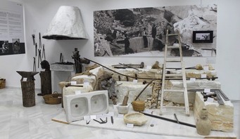 Junto a ellos, la exposición de distintas piezas y elementos contribuye a hacer más atractiva, participativa y experiencial la visita: piezas arqueológicas, fotografías en gran formato tanto antiguas como actuales, pantallas de video, maqueta del área de extracción hecha en mármol blanco Macael, recreación de una cantera, de una fragua y de un taller de artesanía, con herramientas y utensilios utilizados antiguamente, diferentes muestras de minerales extraídos de la zona de canteras, de las semillas autóctonas utilizadas en la restauración de escombreras, de variedades de mármoles y travertinos locales, nacionales e internacionales que se trabajan en Macael, de acabados del mármol, de distintas piezas artísticas y de artesanía hechas en mármol, y de piedras artificiales, la réplica exacta de dos de los leones del Patio de los leones de la Alhambra, réplicas de elementos de extracción utilizados en la antigüedad y procedentes del atrezzo de la película “The handbook of exodus”, dirigida por Ridley Scott y rodada en las cante¬ras de Macael.