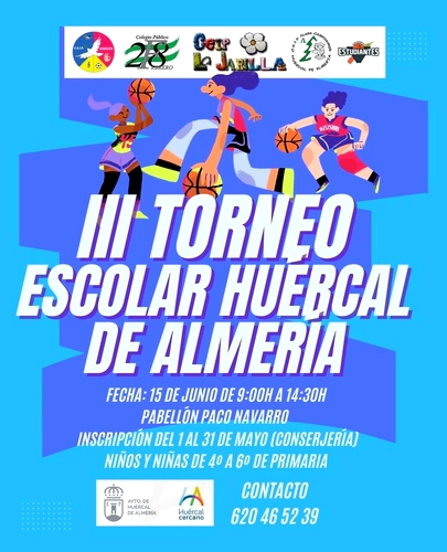Un año más, los niños y niñas de los cuatro colegios de Huércal de Almería volverán a encontrarse en torno a la práctica deportiva con la tercera edición del Torneo Escolar de Baloncesto, organizado por el Ayuntamiento de Huércal de Almería, que se celebrará este sábado 15 de junio en el Pabellón Municipal Paco Navarro de la localidad huercalense, de 9:30 a 14:30 horas, y que reunirá a 150 alumnos.