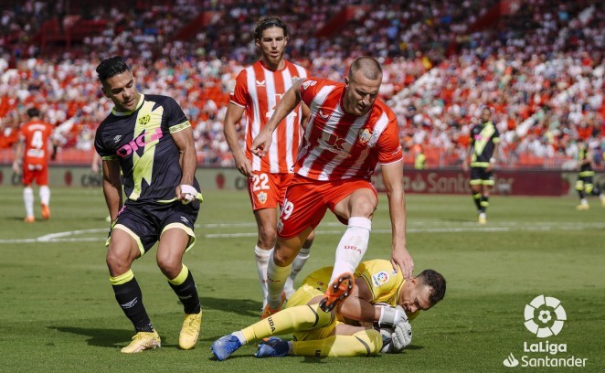 En 16 minutos el Almería ya mandaba 2-0 con goles de Robertone, marcó en el 8 al aprovecharse de una indecisión del meta visitante ante la presión de Embarba, y de Babic a la salida de un córner lanzado por el exfutbolista rayista. Otro ex del Rayo, Leo Baptistao, pudo marcar antes, en el 6.