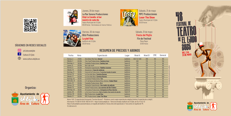 El área de Cultura del Ayuntamiento de El Ejido inicia esta mañana la venta de abonos para disfrutar de los grandes espectáculos de sala del 48 Festival Internacional de Teatro de El Ejido, que se desarrollará entre el 2 y el 31 de mayo.
