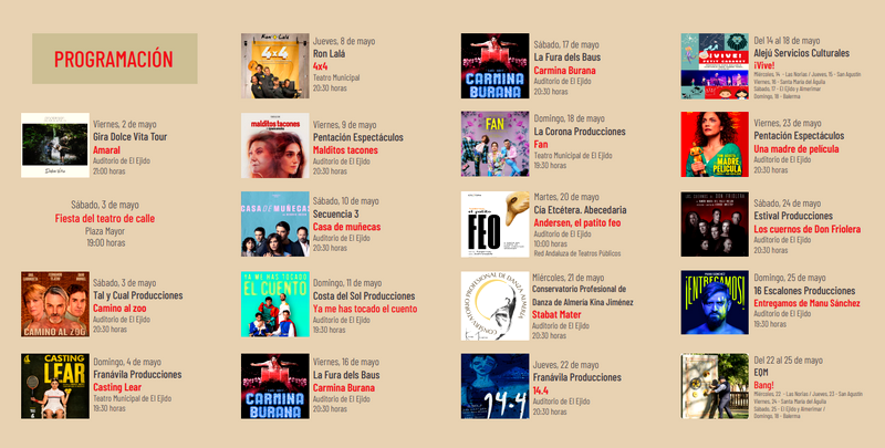La primera de las grandes obras de sala programadas en este 48 Festival Internacional de Teatro de El Ejido será ‘Camino al Zoo’ el 3 de mayo; a la que seguirán ‘Casting Lear’, el domingo 4 de mayo; ‘4×4’ de Ron Lalá el jueves 8; ‘Malditos Tacones’ el viernes 9; ‘Casa de Muñecas’ el sábado 10; ‘Ya me has tocado el cuento’ el domingo 11; ‘Carmina Burana’ de la Fura dels Baus el viernes 16 y sábado 17; ‘Fan’ el día 18; ‘Stabat Mater’ el miércoles 21; ‘14.4’ el jueves 22; ‘Una madre de película’ el viernes 23; ‘Los cuernos de Don Friolera’ el sábado 24; ‘Entregamos de Manu Sánchez’ el domingo 25; ‘Chipi La Canalla: el bar nuestro de cada día’ el jueves 29; ‘La piel fina’ el viernes 30; y ‘Loser The Show’ el sábado 31 de mayo.