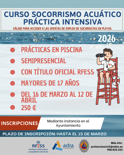 Las solicitudes podrán entregarse por instancia general en el registro de entrada del Ayuntamiento de Adra indicando la solicitud de participación en los cursos de Socorrismo Acuático hasta el 15 de marzo. El curso, que es semipresencial, y tiene un coste de 250 euros, tendrá lugar del 16 de marzo al 12 de abril impartiendo la parte práctica y presencial durante las vacaciones de Semana Santa, en horario compatible con los estudiantes, y con todas aquellas personas que quieran aprovechar estas fechas para conseguir este título. Los asistentes a este curso recibirán al superarlo el título oficial de la Real Federación Española de Salvamento y Socorrismo (RFESS). Para más información, podrá solicitarse a través del correo electrónico proteccioncivil@adra.es o del teléfono 950 033 333.