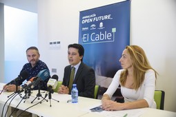 El concejal de Transparencia, Fomento del Empleo y Gestión de Proyectos Europeos del Ayuntamiento de Almería, Manuel Guzmán; el delegado de Economía, Innovación, Ciencia y Empleo de la Junta de Andalucía, Miguel Ángel Tortosa, y la directora del espacio ‘El Cable’, Diana Melero, han presentado este lunes la nueva convocatoria para participar en el “El Cable”, el centro de aceleración de startups que la iniciativa Andalucía Open Future tiene en Almería. Se trata de una convocatoria conjunta con los centros de Sevilla, “El Cubo” y Málaga “La Farola”, que pretende seleccionar hasta 16 proyectos de base innovadora, 4 de ellos para Almería, en áreas como Internet de las cosas (IoT), las ciudades inteligentes (Smart cities), Turismo y hostelería, el ámbito de la eHealth, Industria 4.0 o la tecnología aplicada al mundo rural (Agrotech).