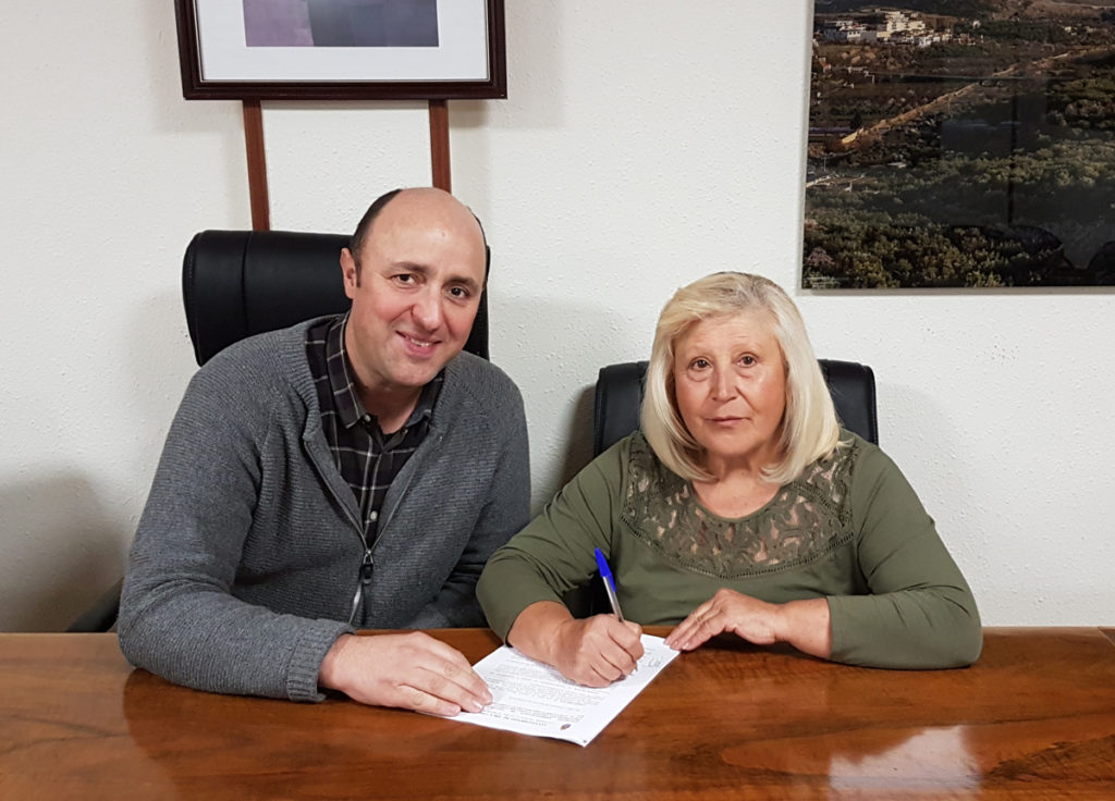 alcalde de Abla, Antonio Oliva, y Mª Teresa Villegas, en representación de la empresa Sierra Solaria SLU, han firmado este viernes el contrato de arrendamiento de una nave municipal ubicada en el paraje de Montagón.