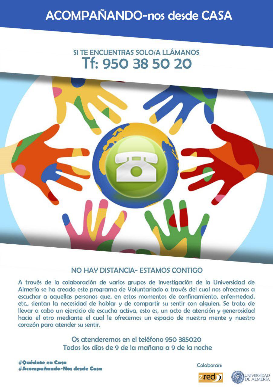 Es una iniciativa que ha surgido para ayudar. Para apoyar a aquellas personas que se sienten solas en estos momentos de confinamiento, y necesitan hablar con alguien. Se llama Acompañando-Nos desde Casa, y su funcionamiento es, a primera vista, simple: a través del teléfono que ha habilitado (el 950 385020), un grupo de voluntarios disponibles en varias franjas horarias los escuchará y los acompañará con su conversación. Los ayudará a paliar su necesidad de comunicación.