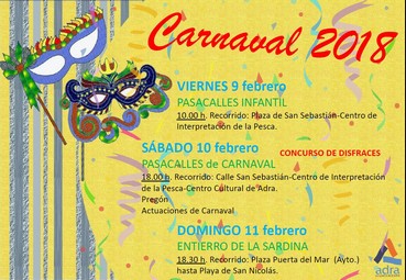 El Ayuntamiento de Adra, a través del Área de Fiestas y Tradiciones, tiene ya previstos todos los actos lúdicos y festivos para celebrar el Carnaval 2018, que contará con tres días llenos de actividades en los que se pretende fomentar esta fiesta, llamando a la participación activa del mayor número de abderitanos y abderitanas.