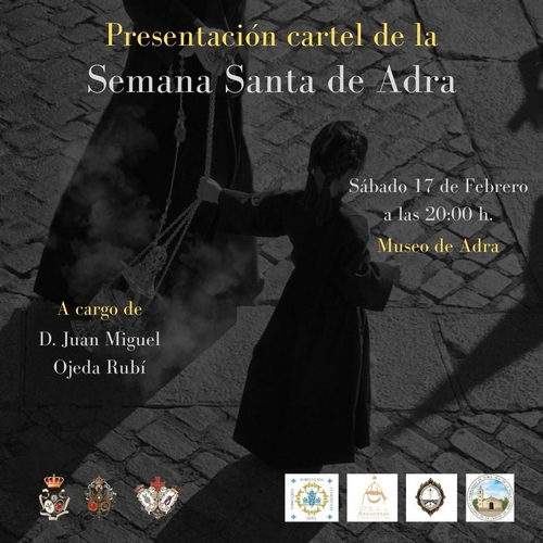 Las Hermandades de Pasión de la ciudad de Adra presentan el próximo sábado, 17 de febrero, el cartel oficial de la Semana Santa de Adra 2024 a cargo de su autor, Don Juan Miguel Ojeda Rubí. Este acto, en el que estarán presentes la Hermandad Sacramental de Nuestra Señora del Rosario y Cofradía de Nazarenos de Nuestro Padre Jesús en su Prendimiento, la Cofradía del Santísimo Cristo de la Expiración y María Santísima de los Dolores y el Santísimo Cristo de la Humildad María Santísima de la Esperanza y la Misericordia, tendrá lugar en el Museo Ciudad de Adra a las 20:00 horas con una entrega de copias a los asistentes al finalizar el acto.