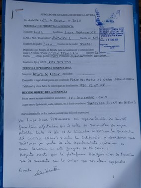 Estas quince familias de Los Cañicos ante la desesperación de no tener agua corriente desde hace 45 días, han iniciado las denuncias procedentes en la Guardia Civil de Albox, en el Juzgado de Huércal-Overa, en la Guardia Civil de Huércal-Overa con fecha 29 de enero de 2020 SIN obtener todavía una solución.