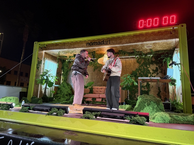Anoche, por fin, se desveló la sorpresa. Tras semanas de expectación, mensajes en redes sociales y un misterioso contador regresivo instalado en pleno corazón de la ciudad, Nomadart mostró su verdadera esencia cuando se fue abriendo, poco a poco, la puerta delantera del contenedor y aparecer sentado en su sofá el cantante urbano Antony Z, acompañado por el músico y productor musical Toni Anzis.