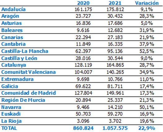 Con incrementos más moderados, ya por debajo de la media nacional, se encuentran Canarias (21,9%), la Región de Murcia (21,3%), La Rioja (19,6%), Galicia (17,4%), la Comunidad de Madrid (17,3%), Euskadi (16,9%) y Extremadura (11%). Los crecimientos más bajos tuvieron lugar en Andalucía (9,1%), Castilla y León (9%) y Asturias (5%).