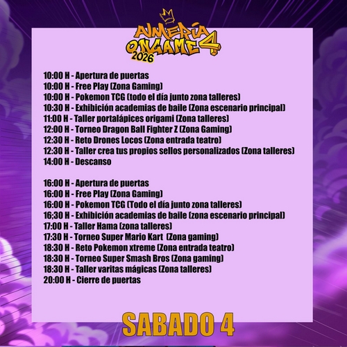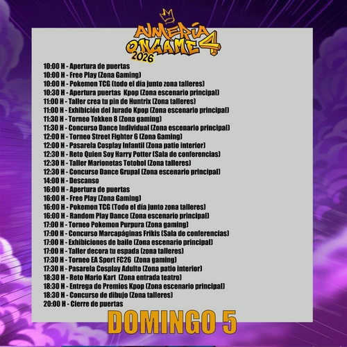 El evento contará con torneos de videojuegos como, entre otros, Tekken 8 y Dragon Ball FighterZ, zonas gaming, experiencias de realidad virtual, exhibiciones de baile con academias y asociaciones de toda la provincia, actuaciones de artistas relacionados con cada temática, cosplayers invitados, talleres creativos y múltiples actividades interactivas para todos los públicos. Como novedad principal, este año se incluyen retos físicos y actividades saludables, con premios que concederá la empresa almeriense Wikari.
