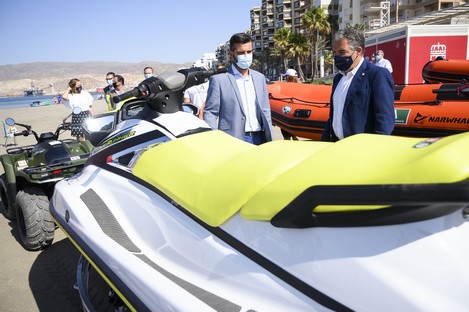 La ciudad de Almería cuenta desde este lunes con doce nuevos vehículos y embarcaciones para mejorar la seguridad en el litoral. El alcalde Ramón Fernández-Pacheco, junto al consejero de Presidencia de la Junta, Elías Bendodo, y la delegada del Gobierno de la administración autonómica en Almería, Maribel Sánchez, han recepcionado esta dotación en la playa de El Palmeral de El Zapillo.