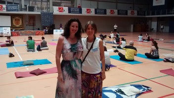 Desde la entrada al Palacio de los Juegos Mediterráneos se podía respirar un ambiente diferente al habitual, con un olor a incienso que impregnaba el ambiente e invitaba a la relajación. Ha sido la contribución de Almería al Día Internacional del Yoga: Una jornada de puertas abiertas en la que tanto iniciados como curiosos pueden participar en un amplio programa de talleres, clases y conciertos, desde las 9:30 de la mañana hasta las 21:30 horas de esta noche y que espera acoger a más de 2.000 participantes. La concejala de Deportes, María Vázquez, acompañada de Patricia López Maza, representante de la asociación de profesores de yoga ‘Merkhaba’, ha visitado la jornada para dar su apoyo “a esta disciplina que cuida tanto cuerpo como mente y que da tan buenas vibraciones a quienes lo practican y a los que están a su alrededor”. El yoga es una ciencia milenaria practicada por más de mil almerienses en 32 centros.