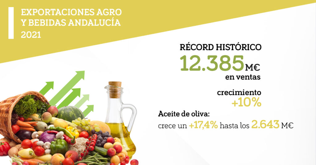Las exportaciones agroalimentarias de Andalucía en 2021 alcanzaron los 12.385 millones de euros, su mejor registro histórico para un año completo desde que existen datos homologables (1995), gracias a un crecimiento interanual del 10%. Así, el agroalimentario se mantiene como un claro sector estratégico, que en el completo de 2021 ha aportado 7.257 millones de euros de saldo positivo con el exterior a la economía andaluza.