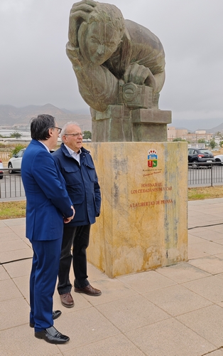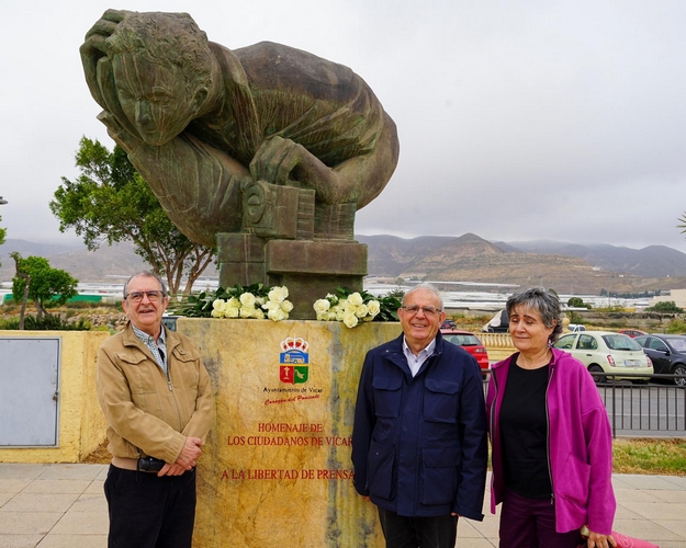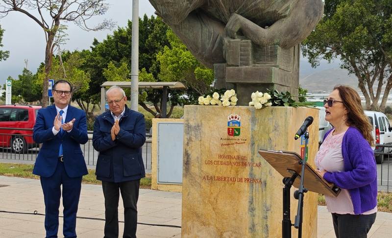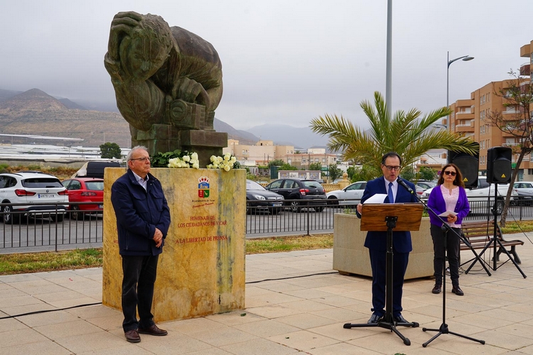 El municipio de Vícar ha sido hoy testigo de un sentido homenaje a los 37 periodistas almerienses fallecidos en los últimos veinte años, en un acto público organizado por la Asociación de la Prensa de Almería (AP-APAL) y por el Ayuntamiento de Vícar, que se enmarcaba en la celebración del Día Mundial de la Libertad de Prensa, coincidiendo a la vez con el XX Aniversario del Bulevar Ciudad de Vícar y la “mayoría de edad” de monumento a la Libertad de Expresión. Durante el homenaje, familiares, miembros de la directiva de la Asociación de la Prensa, con su presidente, José Manuel Bretones, el alcalde de Vícar, Antonio Bonilla y concejales del equipo de gobierno, han depositado al pie del conjunto monumental una rosa blanca por cada de uno de los profesionales desaparecidos desde 2006, en un acto de “gratitud por su legado, por su entrega y por su ejemplo”, como ha destacado en su intervención el presidente de los periodistas almerienses.