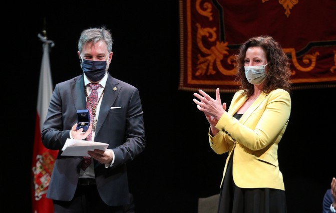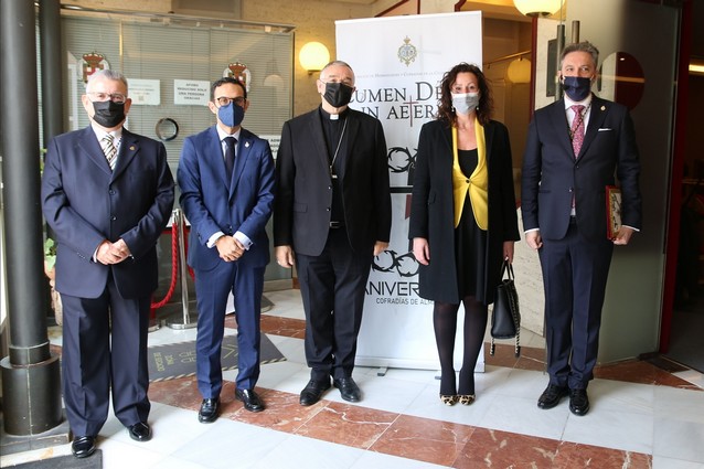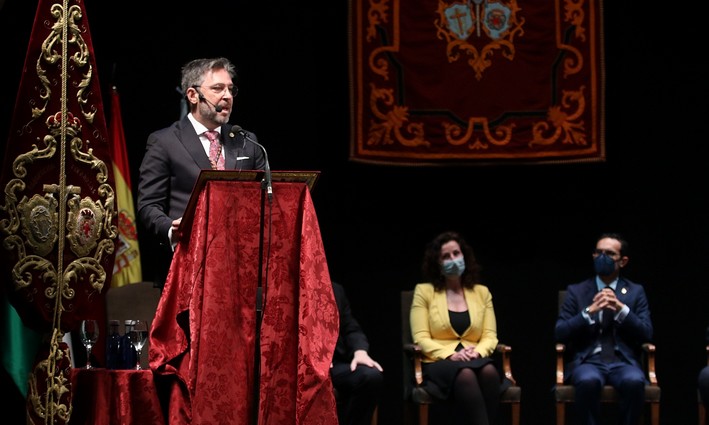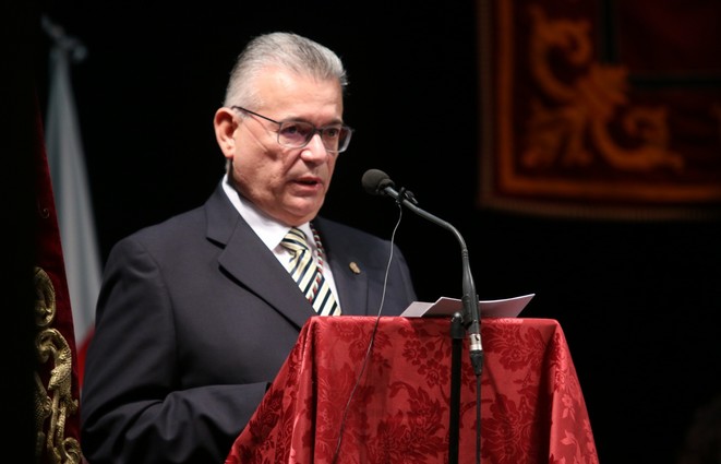 El Hermano Mayor de Estudiantes, que ha recibido el Escudo de Oro de la ciudad de manos de la primera Teniente de Alcalde, María del Mar Vázquez, ha exaltado en el Teatro Apolo la Pasión almeriense tras dos años de espera por la Covid-19.