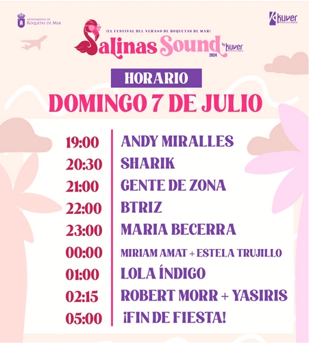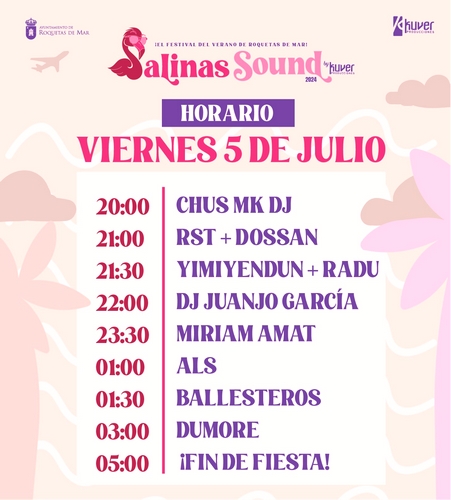 El Salinas Sound 2024 arrancará el viernes 5 de julio a las 20:00, y continuará el sábado 6 y el domingo 7 de julio, comenzando ambos días a las 19:00. Cada jornada del festival finalizará a las 5:00 de la mañana, asegurando largas noches de música y entretenimiento sin parar.