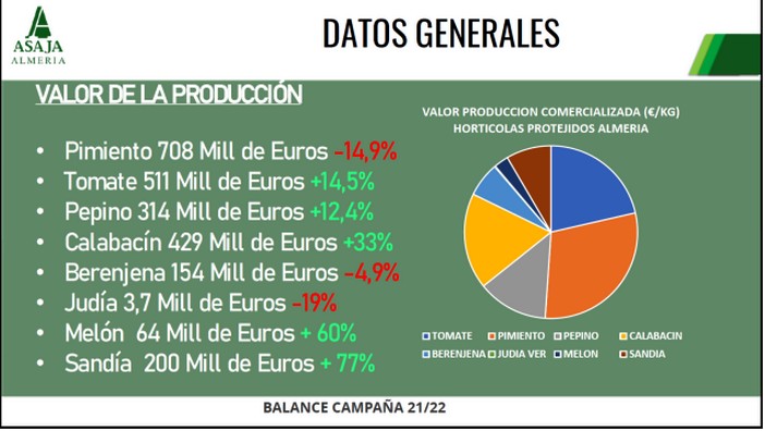 La presidenta provincial Adoración Blanque, ha analizado el último ejercicio agrícola destacando la tendencia de los últimos años en relación al pimiento como líder de la producción hortícola en la provincia superando las 12.627 hectáreas, sustituyendo la posición que años atrás tenía el tomate, y que este año pierde no sólo superficie, un 3% menos, sino también en producción. Junto al tomate, pepino, calabacín, melón y sandía son los productos que mayor valor de producción han logrado en esta última campaña, a diferencia del resto de productos. En conjunto el valor de la producción en la provincia sube un 8,5%.