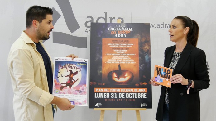 El Ayuntamiento de Adra ha preparado la ‘Gran Castañada del terror’, una programación de actividades terroríficamente divertidas para que niños, niñas y mayores disfruten de la Noche de Halloween. Y es que como cada 31 de octubre, se celebra en toda España y en diversos países del mundo esta fiesta conocida también como la ‘Noche de Brujas’ o ‘Noche de Víspera de Difuntos’. La concejala de Cultura, Elisa Fernández, ha dado a conocer las propuestas organizadas para este día señalado, junto al edil de Bibliotecas, Antonio Sánchez, y Ernesto Zapata, responsable del Departamento de contratación de KUVER Producciones.