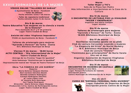 El 8 de marzo, se llevará a los alumnos de quinto y sexto de primaria el teatro educativo ‘Las mujeres en la ciencia a través de la historia’ en el Teatro Ciudad de Berja. Por la tarde, se emitirá en la página de Facebook del Ayuntamiento de Berja el vídeo sobre ‘Virgitanas imparables’.