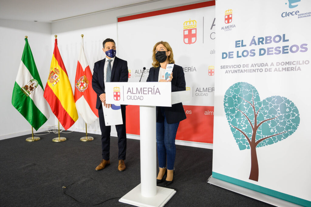 La concejala de Familia, Igualdad y Participación Ciudadana, Paola Laynez, junto al gerente provincial de la empresa de servicios Clece, Diego López, han presentado hoy la segunda edición de ‘El Árbol de los Deseos’. “Una iniciativa solidaria, humana y emotiva con la que pretendemos recoger los sueños de todas las personas usuarias del Servicio de Ayuda a Domicilio con el fin de hacer realidad, al menos, tres de ellos”, ha explicado Laynez.