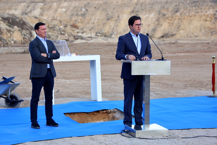 El alcalde de El Ejido, Francisco Góngora, y el presidente de la Diputación Provincial de Almería, Javier Aureliano García, han llevado a cabo hoy el acto de colocación de la primera piedra del Complejo Deportivo Almerimar, acompañados de las corporaciones Municipal y Provincial. Durante el acto se han depositado en una urna objetos y los periódicos del día que, posteriormente, se han enterrado como símbolo del inicio de las obras.