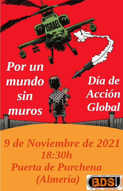 BDS Almería convoca una concentración en la Puerta de Purchena el próximo martes día 9 de noviembre a las 18,30 de la tarde. En el transcurso de la misma se desarrollarán actividades para denunciar la existencia del muro y exigir su demolición.