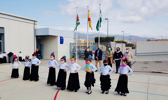 El Consistorio aportó centenares de bocadillos de jamón con tomate y aceite, que fueron degustados por los escolares al término de un acto que se inició con el izado de las banderas de Andalucía, Benahadux y España. Tras las palabras dirigidas por la alcaldesa y por la directora del colegio, tuvo lugar una exhibición de baile a cargo de alumnas de la Escuela Municipal de Flamenco.