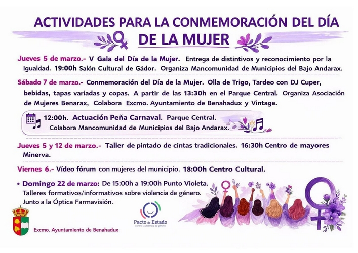 El Ayuntamiento de Benahadux ha organizado un completo programa de actividades para conmemorar el Día Internacional de la Mujer, que se desarrollará del 5 al 22 de marzo e incluirá talleres formativos, gastronomía y actuaciones musicales.