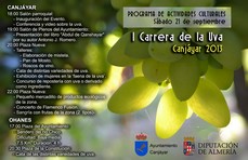 El domingo 22 se celebrará la I Carrera de la Uva cuyo itinerario comienza en la plaza de la Constitución de Canjáyar y seguirá hasta Ohanes por caminos de tierra de gran desnivel, aprovechando pistas forestales y antiguos caminos de herradura para volver a descender hacia Canjáyar aprovechando un tramo del GR-142 que llega al pueblo por la entrada Sur hasta la meta que estará situada en la misma plaza de la Constitución.
