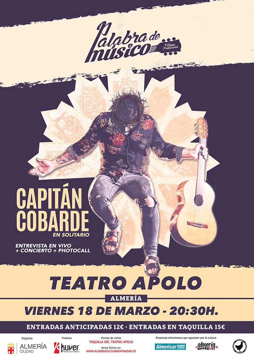 Capitán Cobarde será el protagonista de una nueva cita del ciclo ‘Palabra de Músico’, que vuelve al Teatro Apolo este viernes, 18 de marzo, a partir de las 20.30 horas, en una nueva cita de la programación de invierno del Área de Cultura y Educación del Ayuntamiento de Almería, en este caso con esta atractiva fórmula creada por Kuver Producciones. Lo hará presentando ‘Camino de vuelta’, su flamante último disco en el que muestra a la perfección la fusión del folk de los americanos del norte con su raíz andaluza; y es que lo hace de forma brillante y de manera innata.
