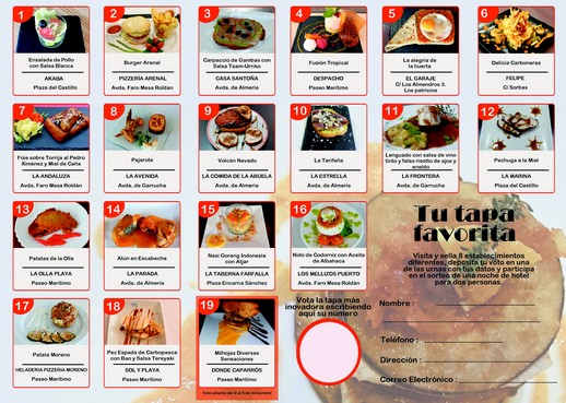 “Para participar, todas las personas podrán recoger su rutero en cualquiera de los 19 esablecimientos participantes, en el Castillo de San Andrés o en la Oficina de Turismo de la localidad. Entre todos los participantes que nos ayuden con su voto a elegir la tapa más innovadora de Carboneras, se sorteará una noche de hotel en media pensión en cualquier lugar de España”, añadió Moreno.
