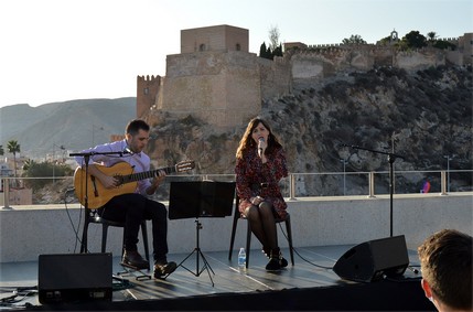 Siguiendo los parámetros fundacionales allá por 2016, la pareja musical formada por la cantante almeriense Carmen Muyor y el guitarrista madrileño Quique Peña, han ofrecido al público, que ha agotado todas las invitaciones gratuitas que se pueden reservar de manera anticipada en www.almeriaculturaentradas.es, un viaje de ‘ida y vuelta’ por los boleros, la canciones íntimas y bellas de los dos lados del mar, España y Latinoamérica, en una agradable tarde soleada.