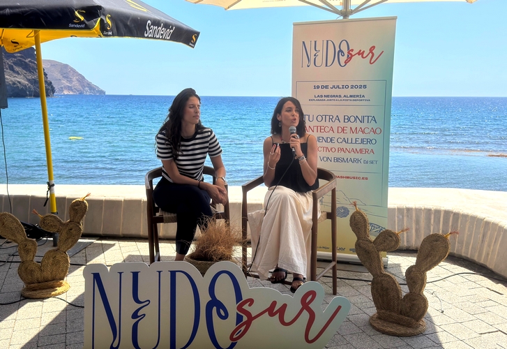 Con la belleza natural del mar Mediterráneo y las pequeñas barcas que adornan el horizonte, el paseo marítimo de Las Negras ha recibido esta tarde la presentación oficial de la primera edición del festival Nudo Sur. Una imagen preciosa que es, precisamente, la elegida para dar a conocer este evento que aúna sol, playa y música y que se estrenará el próximo 19 de julio. El acto ha contado con la presencia la concejal de Alcaldía de Níjar, María José Herrada, y la responsable de Booking & Management de Crash Music, Virginia Pastor.