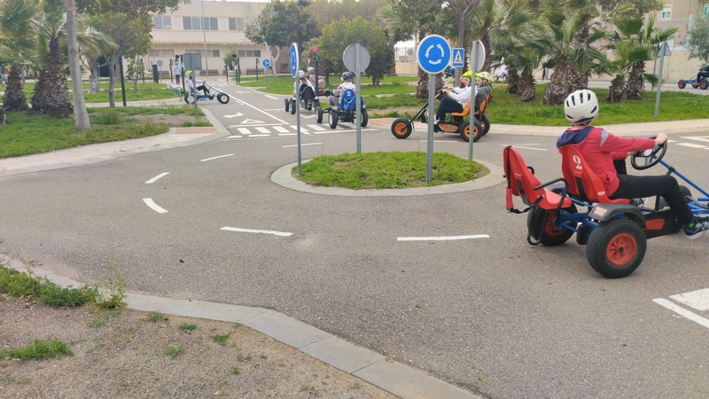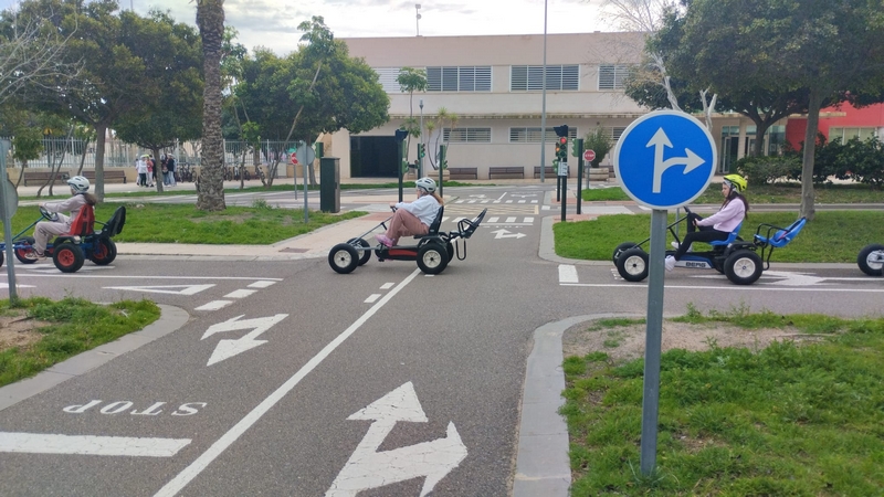 En la segunda parte de la actividad, los alumnos han podido hacer uso de la pista de tráfico del centro, utilizando Kars y bicicletas, para mantener con contacto con el tráfico y sus señales, normativa sobre el uso de patinetes eléctricos y bicicletas.