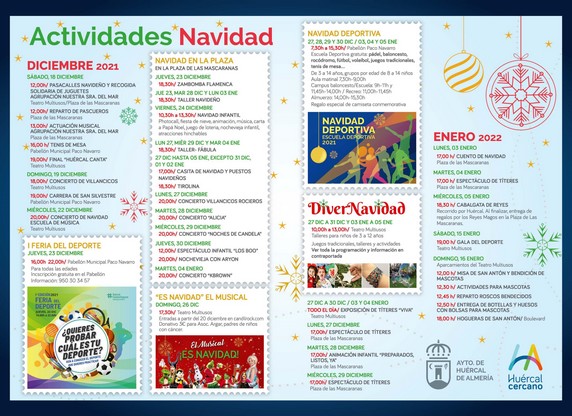 Además, “contamos con varias actividades que van a permitir la conciliación familiar, como ‘DiverNavidad’ en el Teatro Multiusos, con juegos tradicionales o talleres, y la ‘Navidad Deportiva’ en el Pabellón Municipal Paco Navarro, en este caso con actividades enfocadas a la práctica de varios deportes”, así como “musicales, la tradicional Carrera de San Silvestre, la final de Huércal Canta y, por supuesto, la Cabalgata de Reyes”.