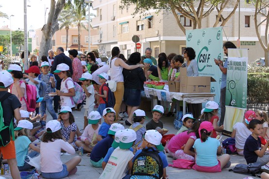 En el acto, organizado por el departamento de Acción Social de CSIF, han participado alumnos de los centros ‘Mar Mediterráneo’ y ‘Rafael Alberti’, así como la Asociación de Vecinos ‘San Antonio Ciudad Jardín’. En el mismo, tanto pequeños como mayores, han podido degustar un desayuno saludable elaborado con productos locales, como son tostadas de tomate y también tomate raf y aceite de oliva virgen extra, acompañado con fruta del tiempo, en este caso, sandía, junto con zumos y agua, todo ello en un excelente ambiente de convivencia en la plaza Elena Pezzi, aledaña a la sede del sindicato.