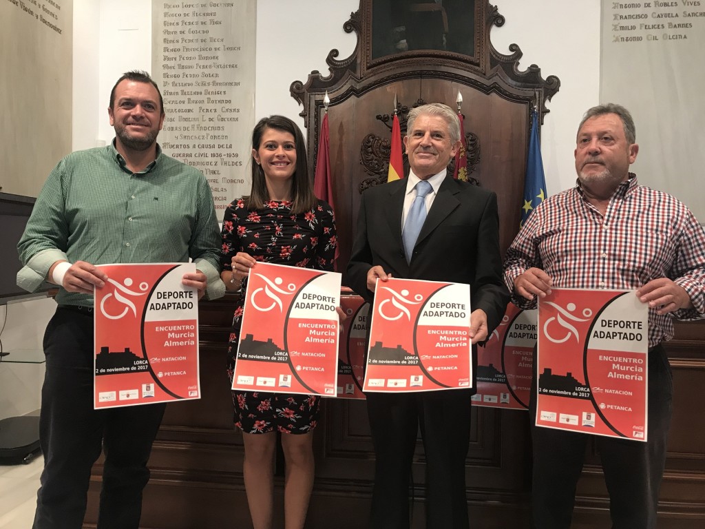 Concejal de Deportes del Ayuntamiento de Lorca, Juan Miguel Bayonas, ha presentado junto al Director General de Deportes de la CARM, Alonso Gómez, el presidente de la Federación de Deportes para personas con discapacidad intelectual en la Región de Murcia (FEDEMIPS-Región de Murcia), José Zomeño, y la diputada provincial de Deportes y Juventud de la Diputación de Almería, Ángeles Martínez, el “II Encuentro Almería-Murcia de Deportes para personas con discapacidad intelectual”, que tendrá lugar el próximo jueves 2 de noviembre en la Piscina de San Antonio y en la Rambla de las Señoritas de La Viña.