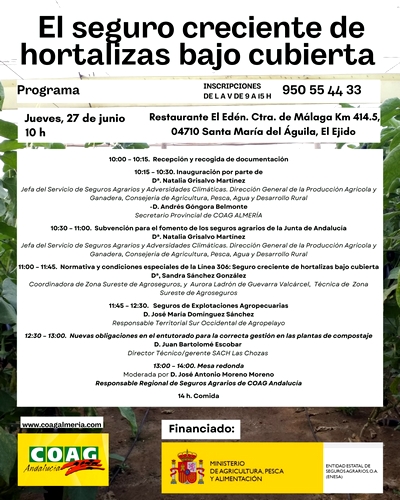 Así la inauguración corrió a cargo de Natalia Grisalvo Martínez, Jefa del Servicio de Seguros Agrarios y Adversidades Climáticas de la Dirección General de la Producción Agrícola y Ganadera de la Consejería de Agricultura, Pesca, Agua y Desarrollo Rural de la Junta de Andalucía; y de Andrés Góngora Belmonte, Secretario Provincial de COAG Almería quien destacó igualmente “la necesidad de ponerse en manos de profesionales pues sólo a través de un asesoramiento especializado conseguiremos una cobertura adaptada a las necesidades de cada explotación, aprovechando todas las opciones que se nos brindan. Confiar en cualquiera, en este tema, es un riesgo añadido ante un escenario que cada día resulta más inestable y con mayor incertidumbre, debido entre otros factores a la impredictibilidad del clima actual”.