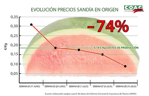 COAG sostiene que los agricultores están cansados de “financiar” la utilización de la fruta de verano como producto reclamo por parte de las grandes superficies comerciales. La caída de los precios de la sandía supone un “efecto arrastre” para el resto de fruta de verano (melón, melocotón, nectarina, ciruela, etc…), lastrando la rentabilidad de las explotaciones durante el resto de la campaña. En el caso del melón, la tendencia ya ha experimentado una clara tendencia a la baja, al pasar de 0,40€/kg semana 26, a cotizar por debajo de 0,25€/kg en semana del 11 de julio.