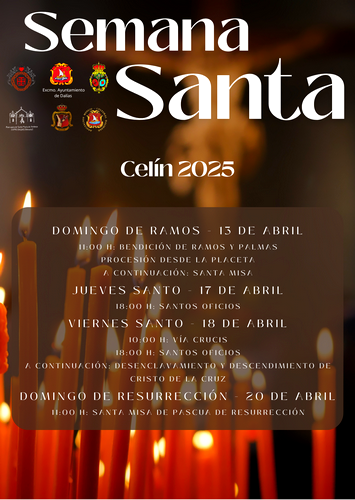El Domingo de Ramos, 13 de abril, llega uno de los momentos más emotivos de la Semana Santa con, a las 11:30 h, la Bendición de Ramos y Palmas en la Plaza de las Flores, seguida de la procesión y la Santa Misa a las 12:00 h. En Celín, los actos comenzarán a las 11:00 h con la bendición y procesión desde la Placeta y, a continuación, la misa.