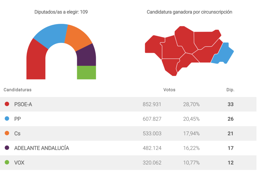 un 100 % del escrutinio, el PSOE gana las elecciones autonómicas en Andalucía y consigue 34 escaños. Esta cifra supone 13 escaños menos que los 47 parlamentarios obtenidos en los comicios de 2015.