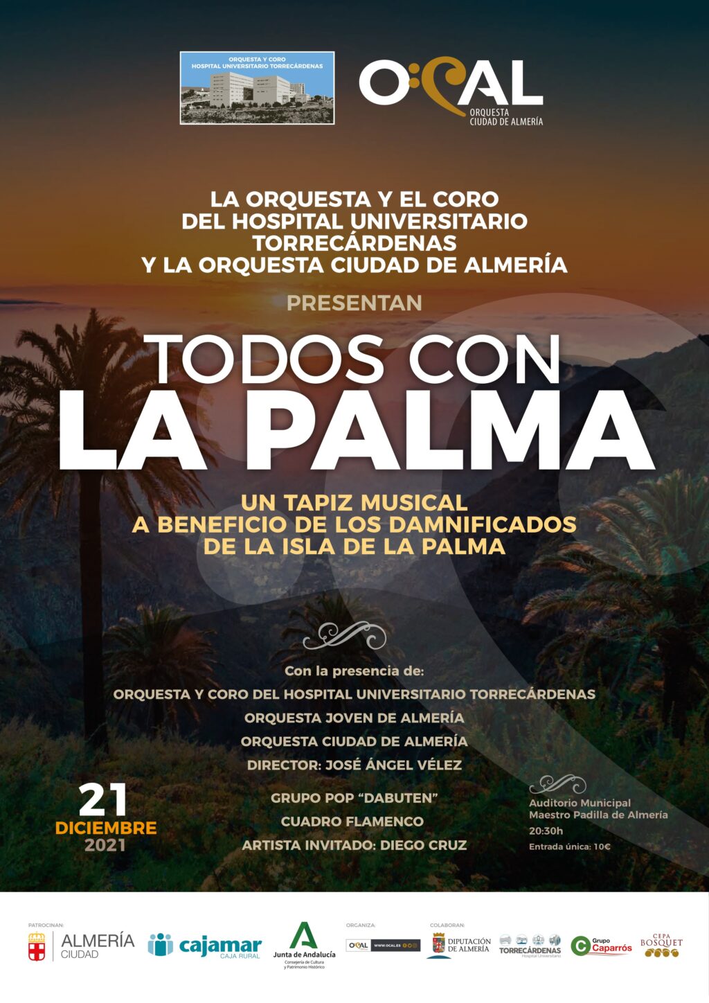 El evento tendrá lugar el próximo 21 de diciembre a las 20.30 horas en el Auditorio Municipal Maestro Padilla. Las instituciones sanitaria y cultural presentarán un tapiz musical a beneficio de los damnificados de la isla de La Palma. Para ello, durante el transcurso del espectáculo, que dirigirá con maestría José Vélez, los asistentes podrán disfrutar de la presencia de la Orquesta y el Coro del Hospital Universitario Torrecárdenas; la Orquesta Joven de Almería; la Orquesta Ciudad de Almería; el Grupo Pop “Dabuten” y Cuadro Flamenco.