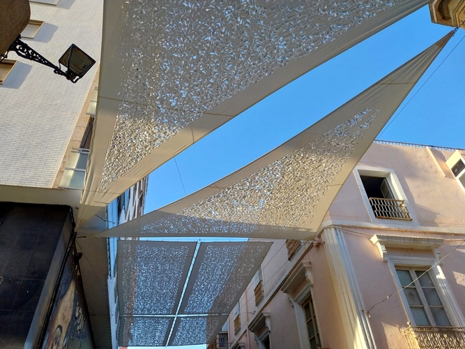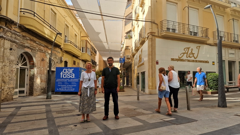 El objetivo de esta actuaciónes la de “proteger del sol entornos peatonales y comerciales de esta ciudad”, ha recordado Pérez de la Blanca. En cuanto al material que se ha utilizado, “el tejido de estos toldos es ignífugo, de polietileno de alta densidad y diseñado para combinar máxima protección solar, resistencia y durabilidad permitiendo, además, el paso de aguas para evitar acumulación de lluvias”.