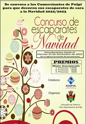 Las concejalías de Comercio y Cultura del Ayuntamiento de Pulpí, con la colaboración de ACEPUL, convocan a los comerciantes y vecinos de Pulpí para que decoren sus escaparates con adornos navideños, así como a todos los vecinos de Pulpí para que realicen Belenes en sus casas y participen en los dos concursos navideños 2022, para los que podrán optar a distintos premios.