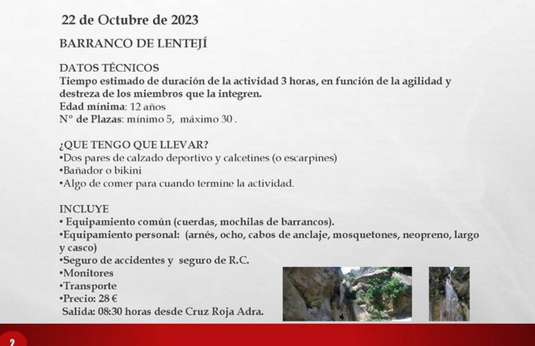 La próxima parada de esta programación con más de una veintena de citas tendrá lugar el próximo domingo, 22 de octubre, con ‘Barranco de Lentejí’. Se trata de una actividad de barranquismo con una duración aproximada de 3 horas y que tan solo dispone de un máximo de 30 plazas, para las que ya está abierta la inscripción previa, que ha de realizarse a través del correo electrónico juventud@adra.es o el teléfono 677 942 005.