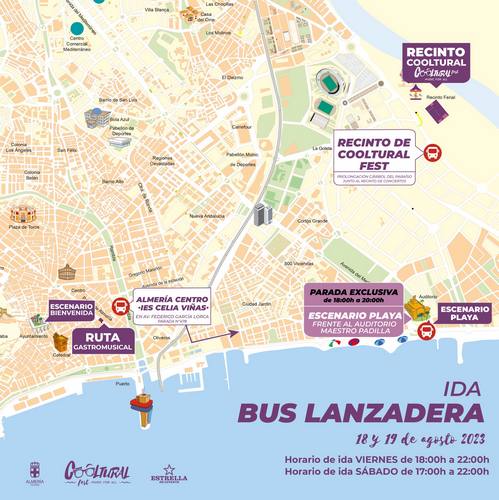Con el objetivo de ayudar a descongestionar el tráfico en días en los que se prevé un intenso tránsito y aglomeración de vehículos, Cooltural Fest ha habilitado un Bus Lanzadera con transporte de ida y vuelta en autobús desde varias paradas de Almería hasta el Recinto de Conciertos, donde se realizan los conciertos los días 18 y 19 de agosto y viceversa, con parada especial en ‘Escenario Playa’, junto a la Faluca, donde se desarrollan los conciertos diurnos. La ida funcionará de 18:00h a las 22:00h (viernes) y de 17:00 a 22:00 (sábado), con parada exclusiva hasta las 20:00h junto al Escenario Playa.