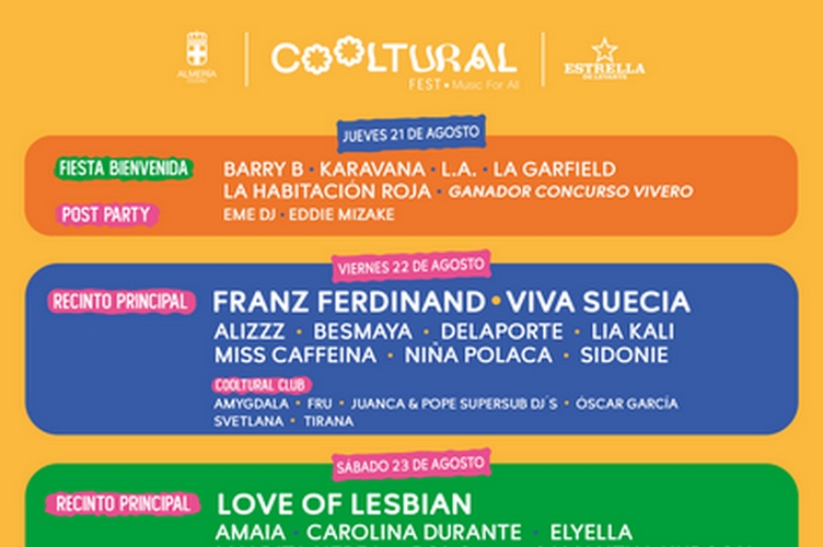 Es uno de los momentos más esperados por los asistentes al festival y hoy por fin se ha cumplido su deseo. Cooltural Fest ha desvelado hoy la distribución por días del impresionante cartel para su octava edición, que se celebrará del 21 al 24 de agosto en la capital almeriense, tanto en el Recinto de Conciertos del Ferial como en el Escenario Playa, junto a la Faluca del Paseo Marítimo, todo ello de la mano del Área de Cultura, Tradiciones y Fiestas Mayores del Ayuntamiento de Almería y Crash Music.