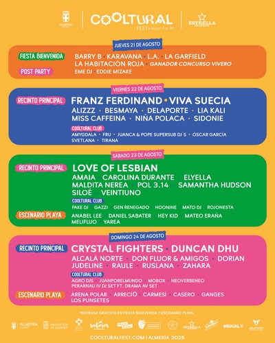 Siguiendo con la premisa de una apertura estilística que le convierten en una de las citas más abiertas a todo tipo de públicos, Cooltural Fest cuenta los días para vivir, una vez más, la mejor edición de su historia, organizado por Crash Music y el Ayuntamiento de Almería, con el apoyo de Diputación Provincial y Sabores de Almería, Fundación Music For All, Estrella Levante, Schweppes, Brugal y Cupra Indalo Motor.